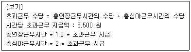 당 회사는 초과근무에 대해 수당을 지급하고 있다. 아래 [보기]의 계산 기준을 토대로 2015 년 5 월 귀속 ‘이종현’사원에 대한 초과근무수당을 계산하면 얼마인가? * 본 문제는 시뮬레이션 문제로서 [실기메뉴]의 메뉴를 활용하여 문제에 답하시오.