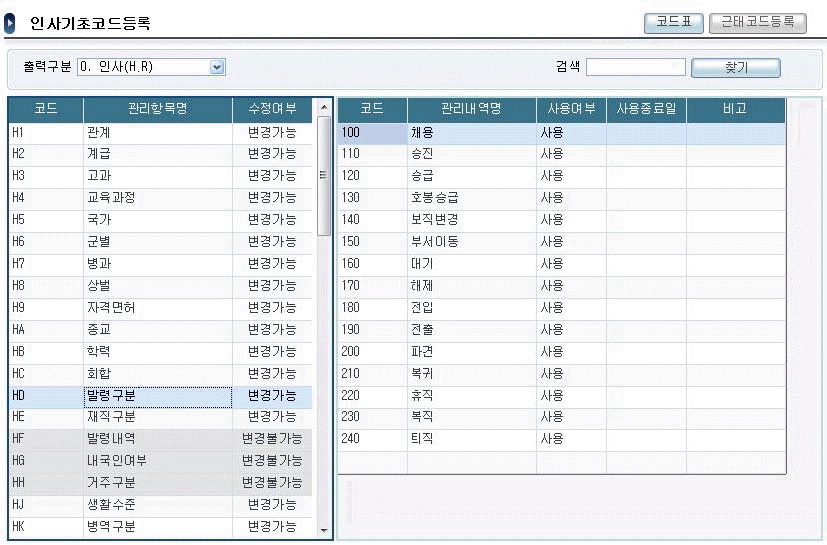 핵심ERP의 인사기초코드등록 메뉴에 대한 다음 설명 중 가장 적절하지 않은 것은 무엇인가?