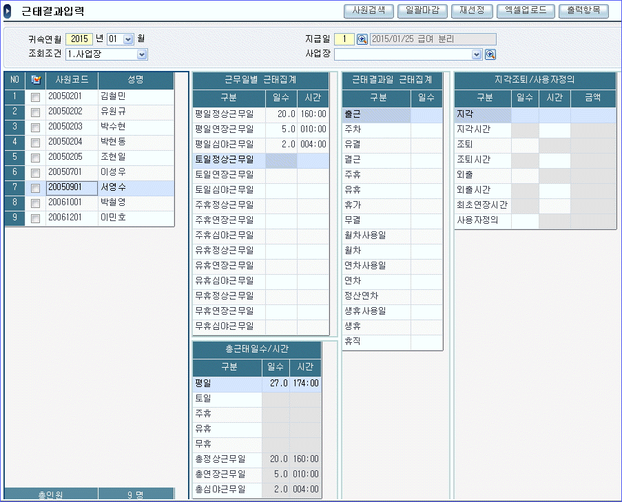 다음은 핵심ERP의 [근태결과입력] 화면이다. 입력된 근태집계 내용에 대한 설명으로 적절하지 않은 것은 무엇인가?