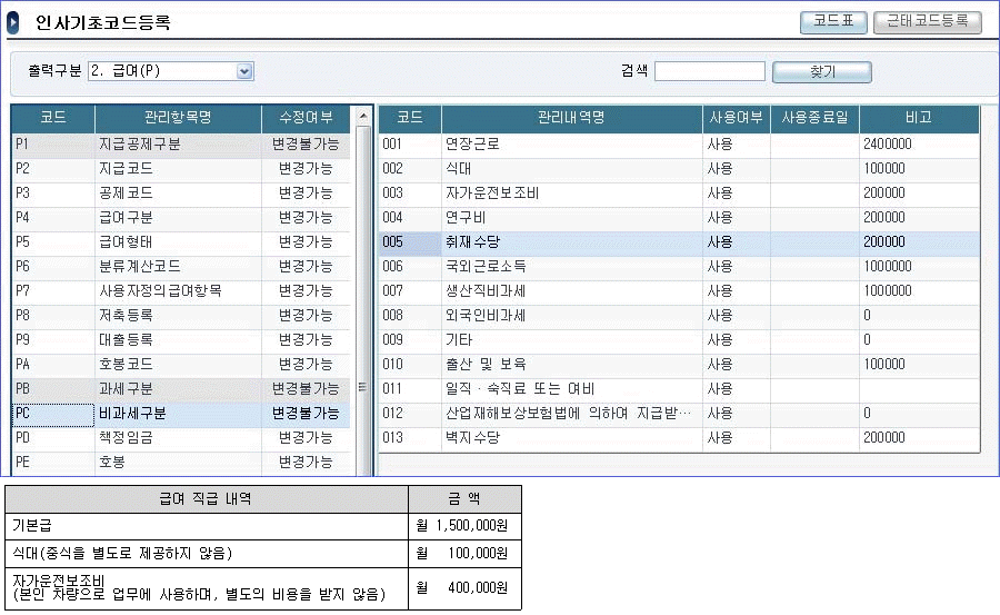 다음의 자료를 이용하여 핵심ERP의 [상용직급여입력및계산] 메뉴에 “과세/비과세”를 구분하여 입력할 경우 사무직 김영업의 1년간 총급여액은 얼마인가?