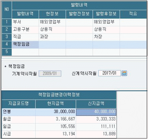 다음은 핵심 ERP [인사발령(사원별)] 메뉴의 화면이다. 인사발령을 진행 시, 발령정보의 영향을 받지 않는 메뉴는 무엇인가?