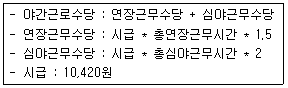 2017년 11월 귀속 근태내역이 입력되어있다. 아래 [보기]의 계산식을 이용하여 '정영수' 사원의 '야간근로수당'을 계산하면 얼마인가? 단, 원단위 금액은 정상 표기한다. (본 문제는 시뮬레이션 문제로서 [실기메뉴]의 메뉴를 활용하여 문제에 답하시오.)