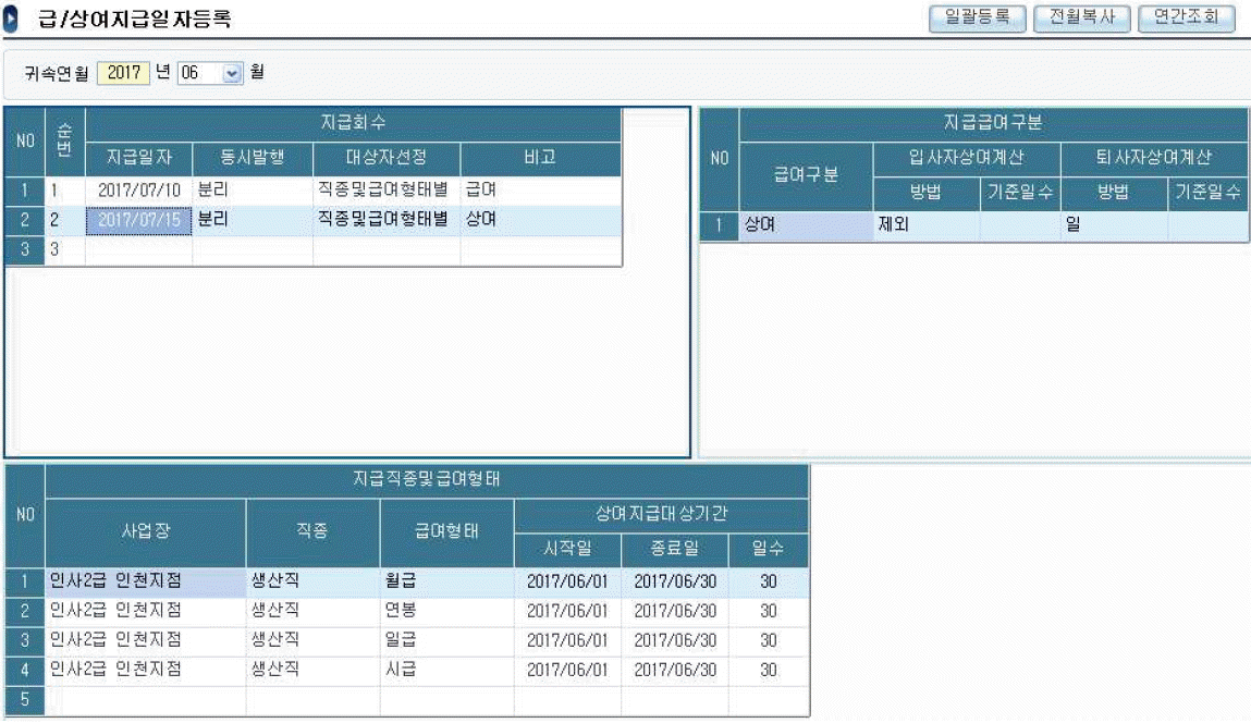 다음은 핵심ERP의 [급/상여지급일자등록] 화면이다. 다음 중 화면에 대한 설명으로 바른 것은 무엇인가?