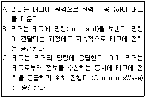 다음 보기에서 리더와 수동형 태그 사이의 신호전달 과정을 순서대로 옳게 나열한 것은?