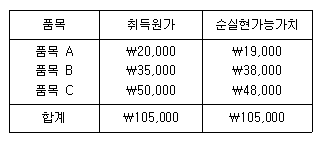 다음 [보기]의 자료를 기초하여 재고자산 종목별로 저가법(LCM: lower of cost or market)을 적용할 경우 기말에 기록될 재고자산평가손실은 얼마인가?