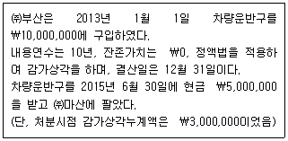 다음 [보기]의 내용을 참고하여 계산한 2015년 6월 30일 처분시점의 차량운반구 장부가액은 얼마인가?