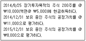 ㈜한국은 장기투자목적으로 금융자산을 보유하고 있다. 다음 [보기]의 자료를 참고로 하여 계산한 2015년도 말 현재 매도가능증권평가손익은 얼마인가?
