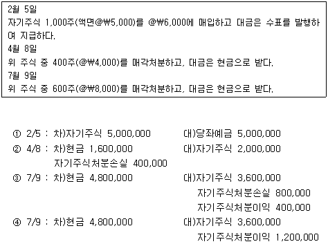 다음 [보기]의 2015년도 ㈜민국의 자기주식 관련내용을 참고로 한 일자별 분개내용 중 가장 적절한 것은 무엇인가?