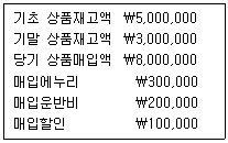 다음 [보기]의 자료를 활용하여 상품을 매출하는 (주)한국의 당기 상품매출원가를 계산하면 얼마인가?