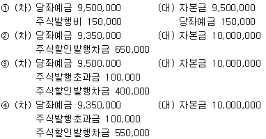 ㈜한국은 주주총회 결의에 의해 회사 주식(1,000주, 액면가 10,000원)을 9,500원에 발행하고 주식발행관련 비용 150,000원을 차감한 잔액을 모두 당좌예금계좌로 입금하였다. 주식 발행일 기준 주식발행초과금 잔액이 없을 경우 올바른 회계처리는?
