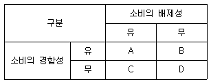다음 표는 소비의 경합성과 배제성의 유무에 따라 재화와 서비스를 구분한 것이다. 이에 대한 설명으로 옳은 것은?