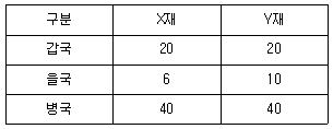 갑국, 을국, 병국이 노동만을 생산 요소로 하여 X재와 Y재 중 한 재화만 생산할 때 최대 생산량은 다음 표와 같다. 이에 대한 설명으로 옳은 것은? (단, 각 국의 생산 가능 곡선은 직선이다)