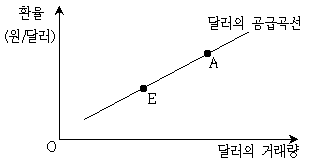 다음 그림은 한국의 외환시장에서 미국 달러의 공급곡선을 나타낸 것이다. 외환시장의 균형점을 E에서 A로 이동시키는 요인으로 옳은 것은? (단, 외환시장은 수요와 공급의 법칙을 따른다)