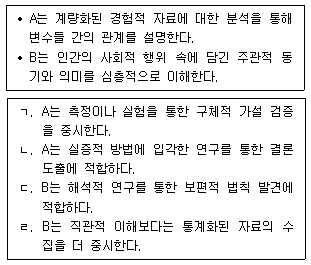 사회ㆍ문화 현상의 연구 방법 A, B의 일반적인 특징에 대한 설명으로 옳은 것을 <보기>에서 고른 것은?