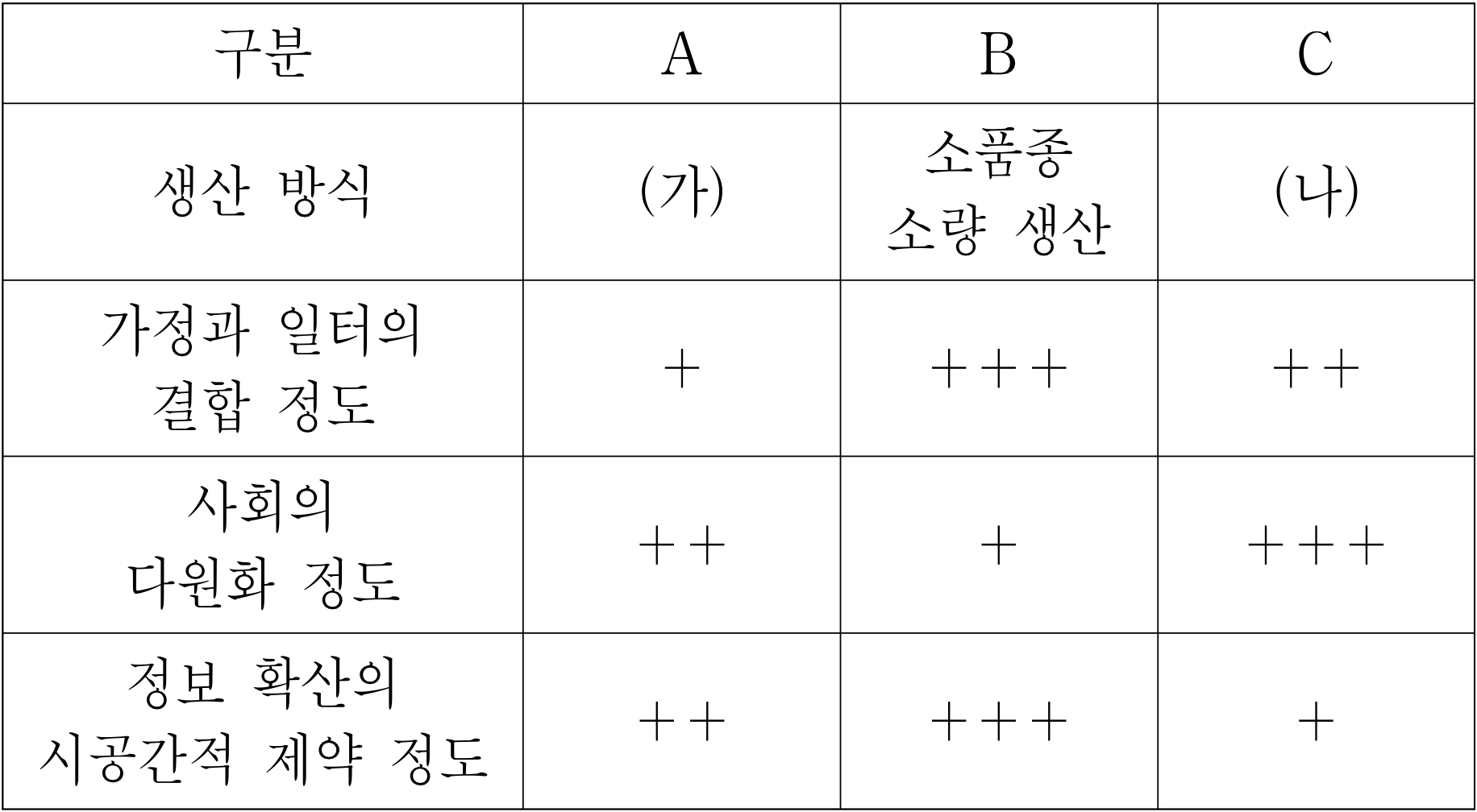 다음 표는 사회 변동에 따른 각 사회 A~C의 특성을 비교한 것이다. 이에 대한 추론이나 일반적 특징으로 옳은 것은? (단, A~C는 각각 농업 사회, 산업 사회, 정보 사회 중 하나이다)
