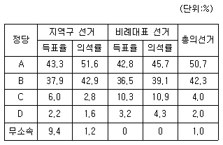 다음 갑국의 국회의원 선거 결과에 대한 추론으로 가장 적절한 것은? (단, 총 의석수는 300석으로 지역구는 254개 선거구에서 254석, 비례대표는 46석이다)