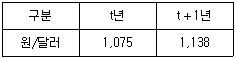 표에 나타난 t년 대비 t+1년 환율 변동에 대한 설명으로 가장 적절한 것은?