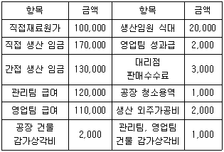 (주)상공전자의 관리팀,영업팀,공장의 6월 관련비용은 다음과 같다. 이중 제조원가항목이 아닌 항목의 합은 얼마인가? (단위 : 원)