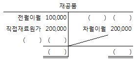 다음은 (주)상공기업의 단일 종합원가계산을 위한 재공품 계정을 나타낸 것이다. 가공원가가 ₩400,000, 제조간접원가가 ₩150,000 일 경우 당월 완성품원가는 얼마인가?