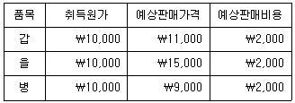 다음은 (주)상공의 기말상품 관련 자료이다. 아래의 3가지 품목은 성격과 용도가 서로 유사하지 않다. 재무상태표에 계상될 기말 상품재고액과 포괄손익계산서에 보고될 매출원가를 계산하면 얼마인가? (단, 재고자산의 평가는 저가법에 의하고, 재고자산 평가손실은 매출원가에 포함시키며 기초상품재고액은 ₩20,000 이고 당기상품매입액은 ₩100,000이다.)