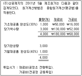 다음 자료를 토대로 (주)상공제지의 20X1년 5월 재료비와 가공비의 완성품환산량 단위당 원가를 계산하면 얼마인가?