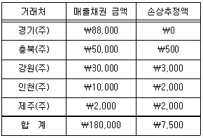 서울(주)의 20X1년 말 현재 매출채권의 장부금액과 손상추정액에 대한 자료는 아래와 같다. 회사의 20X1년 말 재무상태표에 표시될 매출채권 순장부금액과 대손상각비(또는 대손충당금환입)에 해당하는 금액은 얼마인가? (단, 대손충당금 기초잔액은 ₩10,000, 당기 중 거래처 파산으로 인한 대손발생액은 ₩2,000(거래처 부산(주)), 전년도 상각완료한 매출채권에 대한 당기 현금회수액은 ₩1,000이다.)