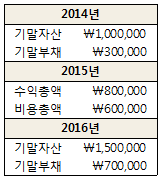 다음은 개인기업인 상공상사의 회계연도별 자료이다. 2016년의 당기순손익을 계산한 것으로 옳은 것은? (단, 회계기간은 1월 1일 부터 12월 31일까지이다.)