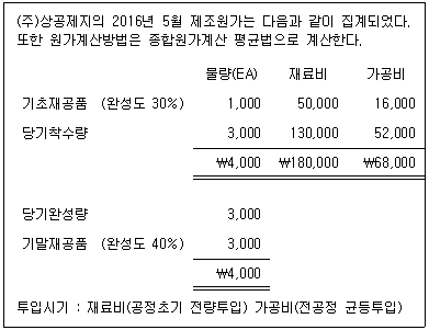 다음 자료를 토대로 (주)상공제지의 2016년 5월 재료비와 가공비의 완성품환산량 단위당 원가를 계산하면 얼마인가?(오류 신고가 접수된 문제입니다. 반드시 정답과 해설을 확인하시기 바랍니다.)