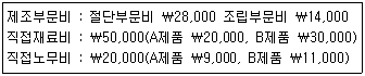 제조부문비(총액 ₩42,000) 제품별 배부액을 직접재료비를 기준으로 계산할 때, 절단부문비와 조립부문비의 배부율은 각각 얼마인가?