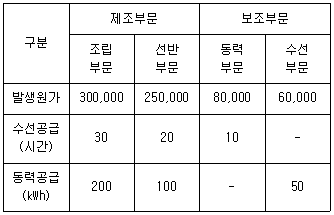 (주)상공은 2개의 제조부문과 2개의 보조부문이 있으며, 각 부문에서 발생한 원가와 보조부문이 제공한 용역수수관계는 다음과 같다. 단계배부(수선부문비를 먼저 배부)법을 사용하여 조립부문에 배부될 보조부문의 원가총액은 얼마인가? (단, 동력부문비는 동력공급량을, 수선부문비는 수선공급시간을 배부기준으로 사용한다.)