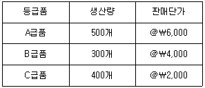 A, B, C의 등급품을 취급하고 있는 (주)상공의 다음 자료에 의하여 등급별 종합원가계산을 할 경우, 완성된 A급품의 단위당 원가를 계산한 것으로 옳은 것은? (단, 판매가치법에 의하며, 등급품의 총 제조원가(결합원가)는 ₩2,500,000이다.)