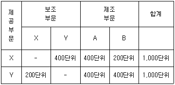(주)상공은 보조부문(X, Y)과 제조부문(A, B)을 이용하여 제품을 생산하고 있으며, 보조부문과 제조부문에 관련된 자료는 아래와 같다. 보조부문 X와 Y에 집계된 부문원가는 각각 ₩600,000, ₩800,000이다. 다음 설명 중 옳지 않은 것은?