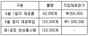 (주)대한은 두 개의 공정을 통해 완제품을 생산한다. 다음은 6월 중에 제1공정의 재료에 관한 자료이다. 단, 재료는 제1공정 착수시점에서 전량이 투입된다. 평균법에 의할 경우 6월 30일 월말재공품에 포함된 재료원가는 얼마인가?