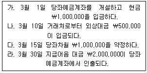 다음은 (주)상공기업의 당좌예금 거래 내역이다. 3월 30일 회계처리로 옳은 것은? (단, 3월 30일 이전 회계처리는 모두 적정하게 이루어진 것으로 가정한다.)