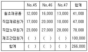 (주)강릉의 제조간접원가 발생액은 ₩100,000이고 직접원가법에 의하여 각 제조지시서에 배부한다. 8월 중 제조지시서 No.45와 No.46은 완성하였고 No.47은 아직 완성하지 못하였다면, 8월 중 미완성품 제조원가를 계산하면 얼마인가?