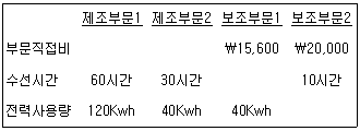 경기회사는 2개의 보조부문과 2개의 제조부문으로 구성되어 있다. 각 부문직접비 및 보조부문의 용역 사용량에 대한 정보는 다음과 같다.