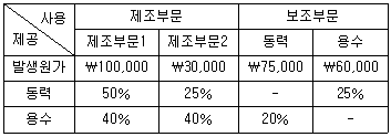부문비 내역과 용역수수관계는 다음과 같다. 직접배부법에 의하는 경우 제조부문2에 배분될 보조부문의 부문비 총액을 계산하면 얼마인가?