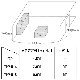 그림은 구획실의 크기가 가로 10,000mm, 세로 8,000mm, 높이 3,000mm이며 가연물 A와 가연물 B가 놓여 있는 상태를 나타낸다. 다음과 같은 조건일 때 구획실의 화재하중[kg/m2]은? (단, 주어지지 않은 조건은 무시하고, 소수점 셋째 자리에서 반올림한다.)