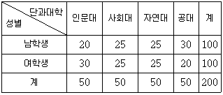 어느 대학교의 4개 단과대학인 인문대, 사회대, 자연대, 공대에서 각각 50명씩 임의추출하여 남학생과 여학생의 수를 조사한 분할표가 다음과 같다.