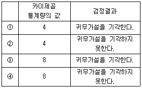 4개 단과대학의 남학생 비율이 모두 같다는 귀무가설을 검정하기 위한 카이제곱통계량의 값과 유의수준 5%에서 검정 결과를 옳게 짝지은 것은? (단, χ2α(k)는 자유도가 k인 카이제곱분포의 제100×(1-α) 백분위수를 나타낼 때 χ20.05(3)=7.81, χ20.05(4)=9.49 이다)