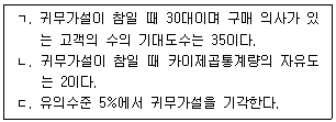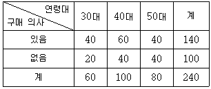 어느 회사에서 차량 내비게이션을 연령대가 30대부터 50대까지인 고객에게 한 달 동안 사용하게 한 후 구매 의사를 알아보기 위해 240명을 임의추출하여 다음과 같은 분할표를 작성하였다.
