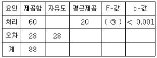 인자의 수준수가 k이고 각 수준에서의 반복수가 n인 일원배치법에서 얻은 분산분석표의 일부가 다음과 같을 때, 이에 대한 설명으로 옳지 않은 것은?