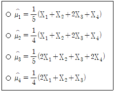 미지의 모평균이 μ이고 모분산이 σ2인 모집단으로부터 확률표본 X1, X2, X3, X4를 추출하여 μ에 대한 점추정량을 다음과 같이 정의하였다. 이 점추정량 중에서 μ에 대한 불편추정량이면서 그중 최소분산을 갖는 것은? (단, σ2 > 0 이다)