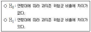귀무가설 H0가 참일 때 구한, 위험군에 속하는 사람 수의 추정된 기대도수와 관측도수 간에 차이가 존재한다. 이 차이의 절댓값이 가장 큰 연령대는?