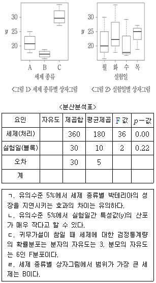 가지 종류의 유기농 세제(A, B, C)에 대해 박테리아의 성장을 지연시키는 효과를 비교하고자 한다. 실험실에서 하루에 3번의 실험만 가능하므로 실험일 월, 화, 수, 목을 블록으로 하여 확률화완전블록설계를 실시하여 다음과 같은 결과를 얻었다. 분산분석을 이용하여 세제 종류별 박테리아 성장 지연 효과의 차이를 검정하고자 한다. 분석결과에 대한 설명으로 옳은 것만을 모두 고르면?