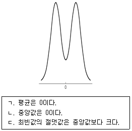 다음은 어느 확률변수의 확률밀도함수이다. 이에 대한 설명으로 옳은 것만을 모두 고르면? (단, 함수는 0을 기준으로 좌우 대칭이다)