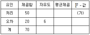 세 가지 필터의 성능을 비교하기 위해 일원배치 분산분석법(one-way analysis of variance)을 실시하여 얻은 분산분석표의 일부가 다음과 같을 때 (가)의 값은?