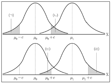 확률변수 X는 N(μ, 1)를 따를때, 가설 H0: μ=μ0 대 H1:μ=μ1 대한 기각역이 R={x:x≥μ1+c}로 주어진 경우, 다음 그림에서 제 1종 오류를 범할 확률에 해당하는 영역(A)과 제 2종 오류를 범할 확률에 해당하는 영역(B)을 옳게 짝지은 것은? (단, μ1>μ0이고, c>0이다) (순서대로 A, B)