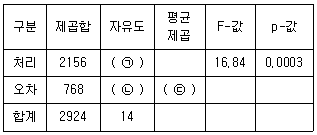다음은 세 가지 속독법(A, B, C)에 따라 책 읽는 시간에 차이가 있는지 알아보기 위해 일원배치분산분석법을 적용하여 얻은 분산분석표이다. 각 속독법에 5명씩 15명을 임의로 배치하여 책을 읽게 한 후, 책 읽는 시간을 측정하였다. 이에 대한 설명으로 옳지 않은 것은?
