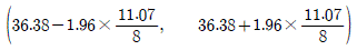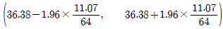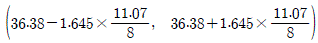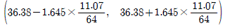 어느 보험회사에서 도시 근로자의 평균 나이(μ)를 추정하기 위하여 64명을 임의로 추출하여 조사하였다. 64명 도시 근로자의 평균 나이가 36.38이고 표준편차가 11.07일 때, 모평균 μ에 대한 95%신뢰구간은? (단, 표준정규분포를 따르는 확률변수 Z에 대하여 P(Z≥1.96)=0.025, P(Z≥1.645)=0.05이다)